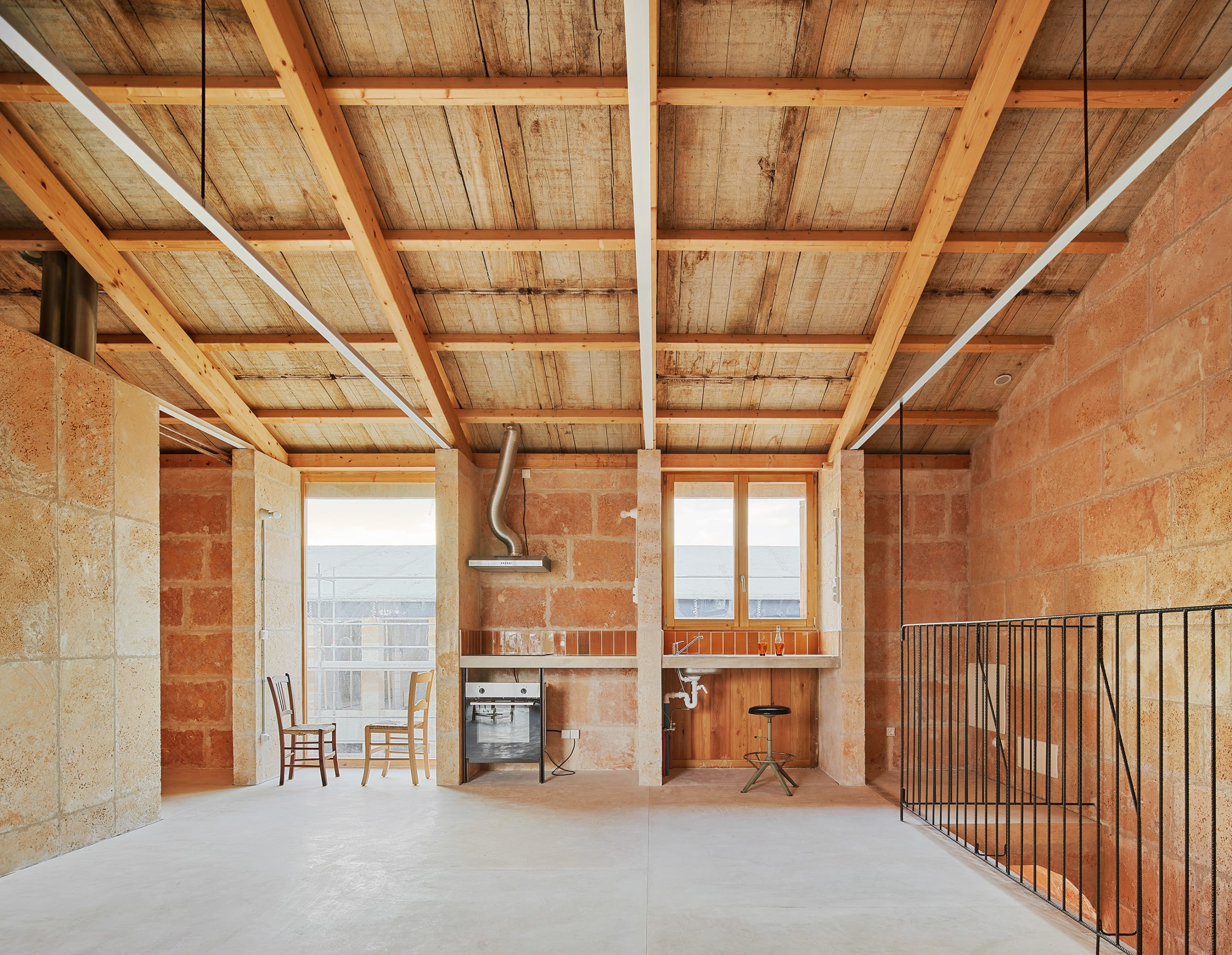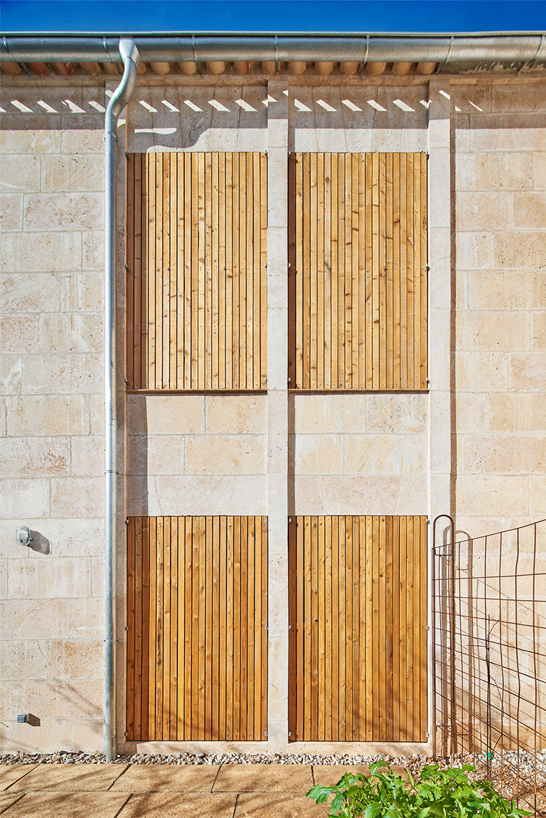On the first floor, the section of the stone pilasters is reduced to 20x80cm to support a light structure of wooden trusses with steel tensors and reused solid wood formwork boards, and the insulation made of 30 cm of dead dry leaves of Posidonia from Cala Estància, at 11km from the site. The pitch roof is solved with traditional Arabic ceramic tiles fired with renewable energies, which is expressed as it is in the perimeter of the roof.