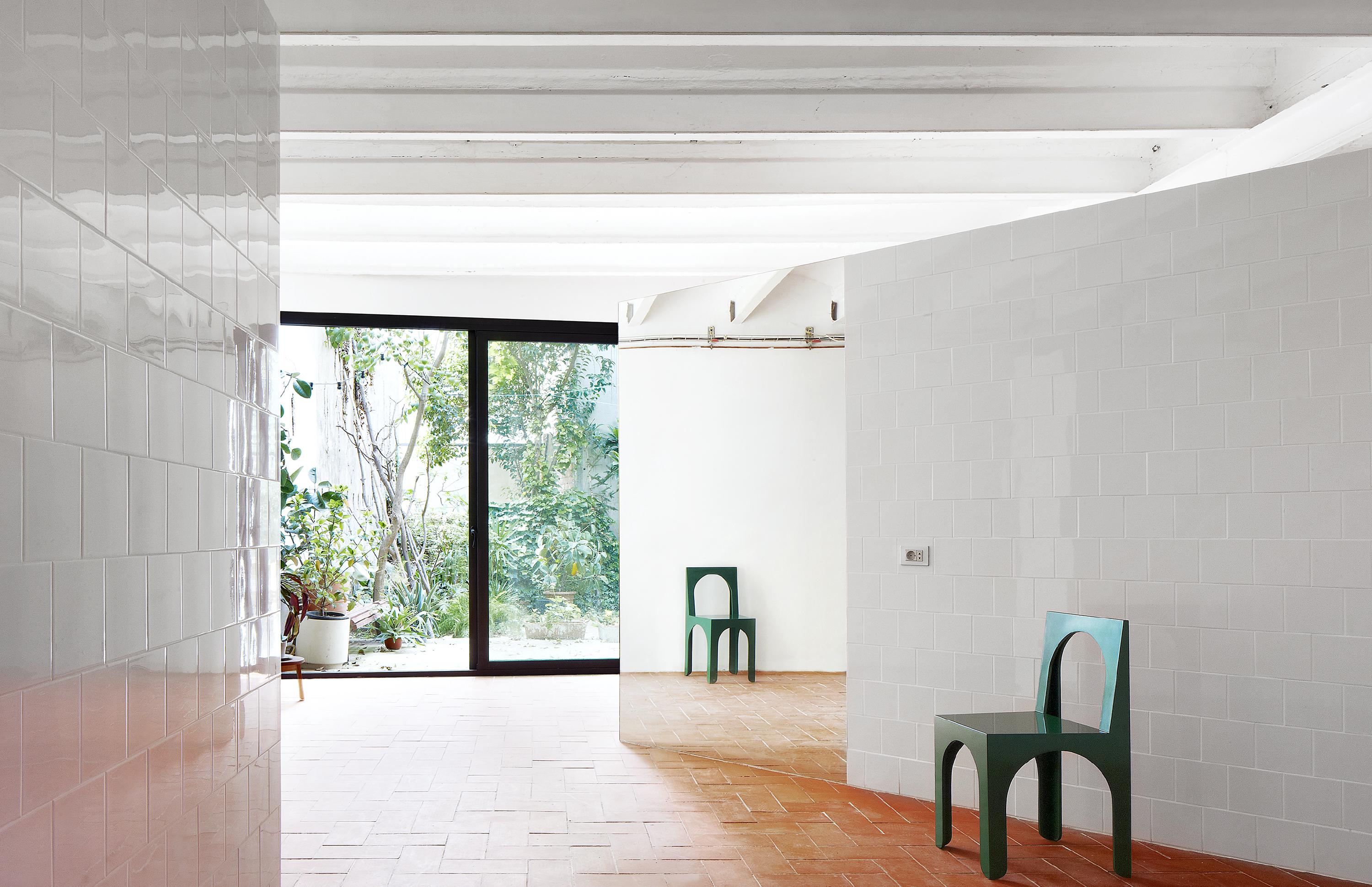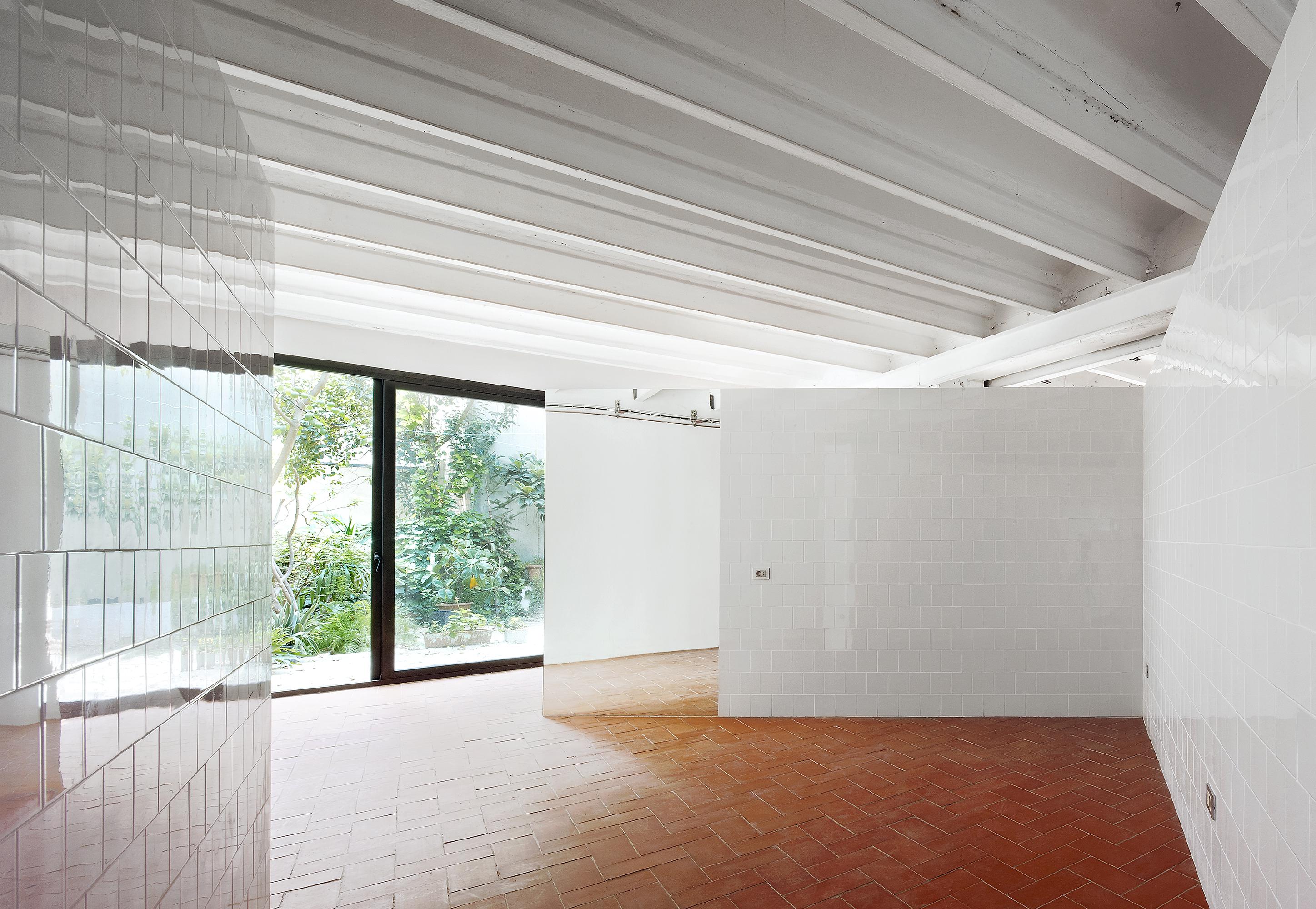 This oblique arrangement strangles and widens space, creating spots of different kinds. This new partition walls actually nor touch the original walls neither reach the height of the ceiling, making clear the difference between the new and the existing. The intention is not to specify the use of each space. The client has the freedom to choose how they occupy the spots depending on what suits their needs best. As for the choice of materials, there is a pronounced Mediterranean accent. Vertical surfaces are covered in shiny materials such as glazed ceramic tile or mirror, so the light coming from the outdoor terrace is multiplied. In addition to the reflection of light, we see the contrast between the pure geometry of the new partitions and the wild vegetation in their reflections. The floor is finished with ceramic as well, but in this case with unglazed clay tiles, which brings a dose of warmth in contrast to the vertical planes.