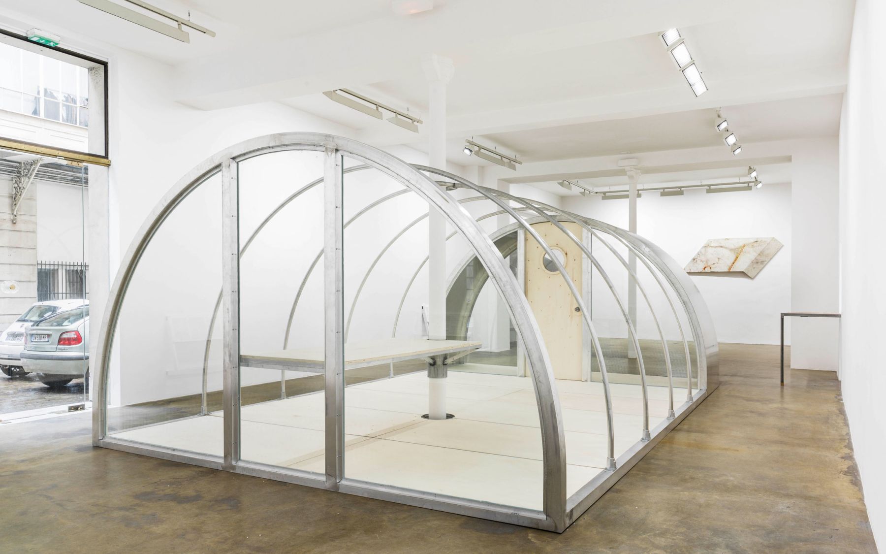 Installation view Oscar Tuazon. Shelters, Galerie Chantal Crousel, Paris, France (2106). Photo: Florian Kleinefenn