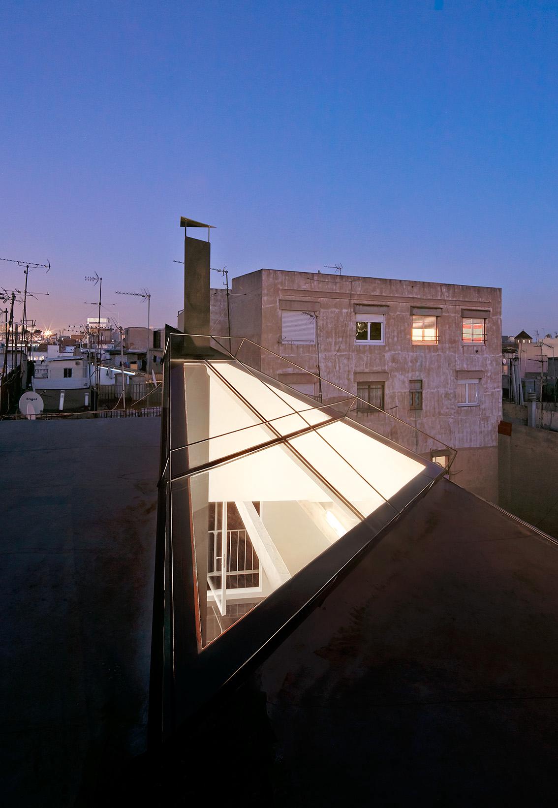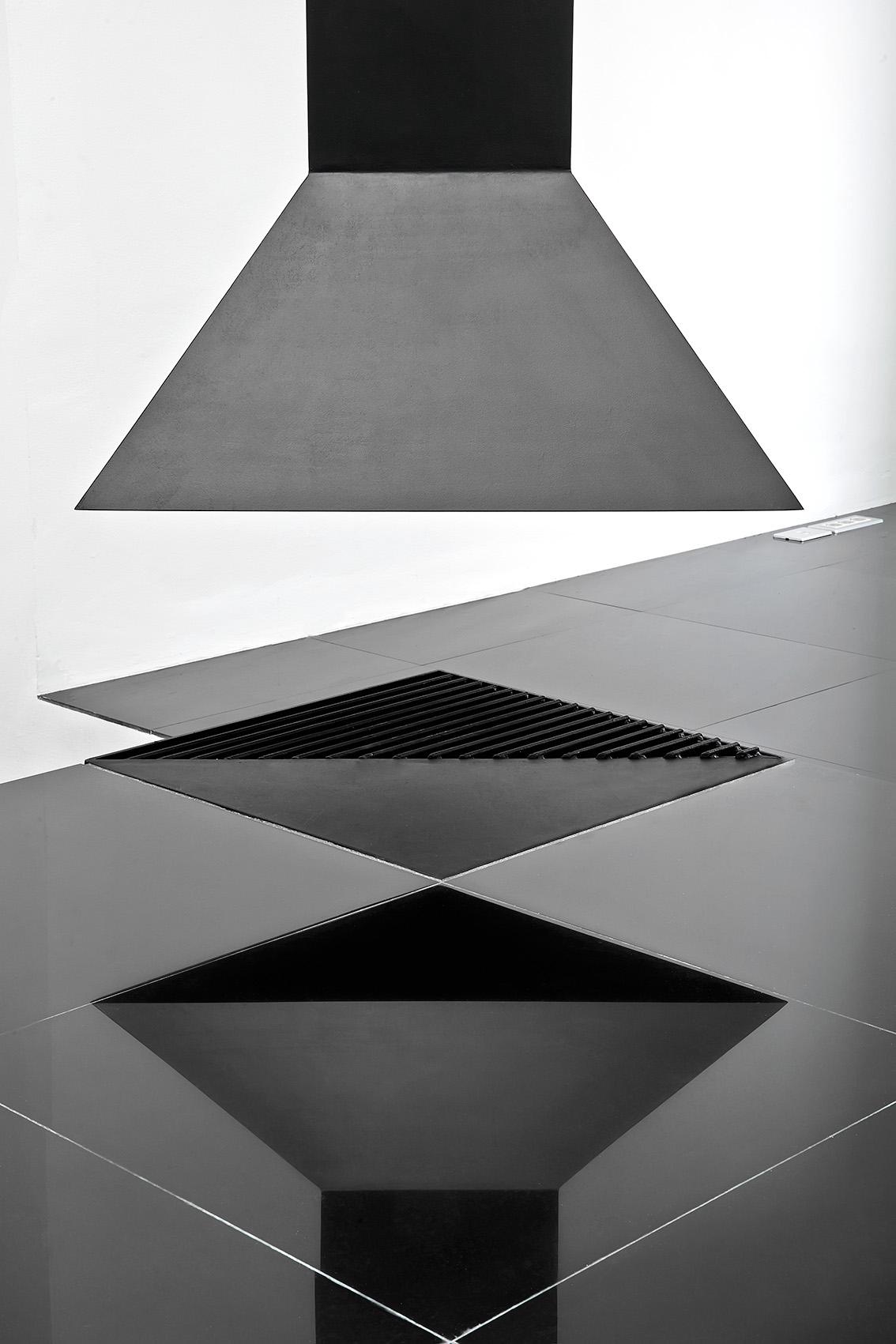 The loft was built on a part of the supposed rooftop terrace of the building. For this reason, the floors maintained the inclination of the old drainage slopes and for this reason the whole apartment t was sloping and uninhabitable. So the main design solution derives from this basic spatial feature and the strategy was based on the idea to divide the flat into four platforms of similar areas, where the fire place is conceived as a central piece and main organizational element. This chimney, triangular in base, ascends to the skylight that on its behalf allows the sky to enter the house and the clouds to be reflected in the shiny porcelain floor.