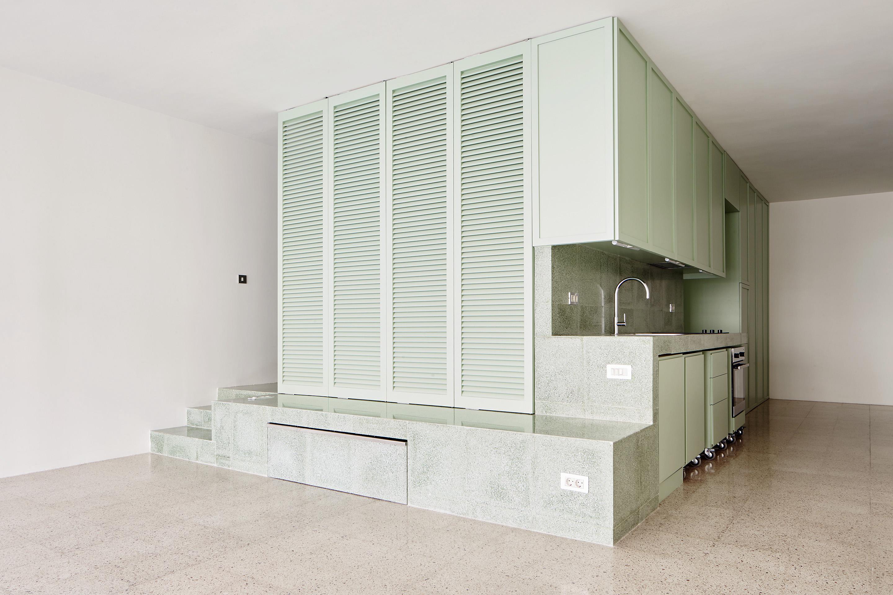 The strategy consists in a compact volume that resolves the bedroom, the kitchen and the bathroom as a space reduced to one of the corners of the available area. The bedroom is placed on a higher level regarding to the surrounding space and its private condition is reinforced. The thickness that generates the new level serves to define a volume of the height of a bench where people can sit down to eat, but also can place a tv or any other kind of objects. The raised bedroom is interconnected with the kitchen and the open area by steps and also its privacy can be regulated by a set of folding shutter doors... A mirror wall gives back to the bedroom and opens up to the bathroom, which has a recessed bath.